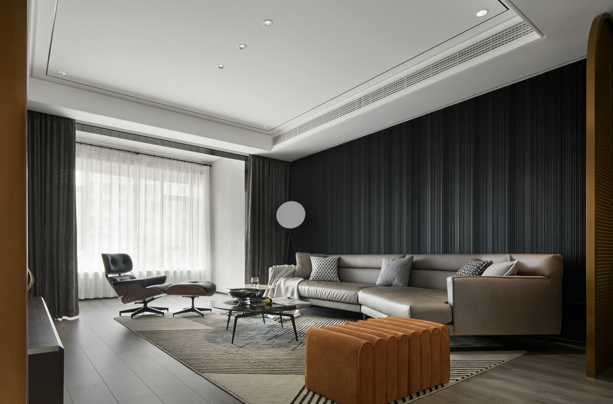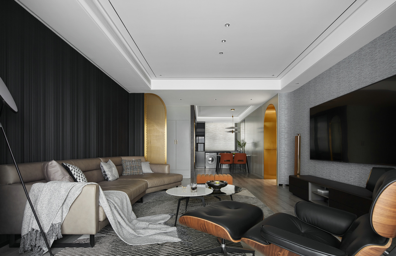 餐廳與客廳之間毫無阻隔,可以想象與好友們相聚用餐時(shí)的開放與隨性,不拘泥于空間的功能性。金色的包邊線條與白色皮革組合,產(chǎn)生一種當(dāng)下潮流的時(shí)尚之美,同時(shí)透過色彩搭配,來增強(qiáng)空間的整體性。