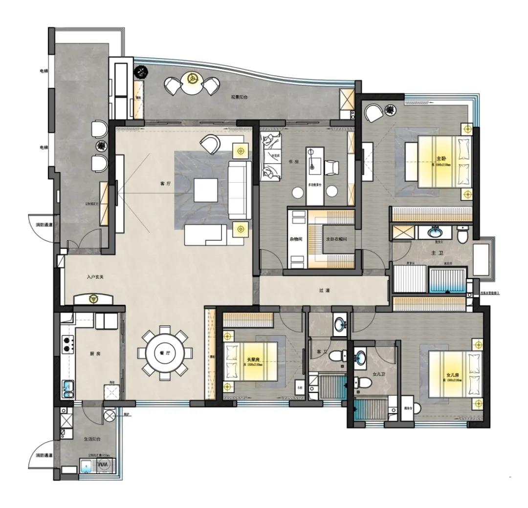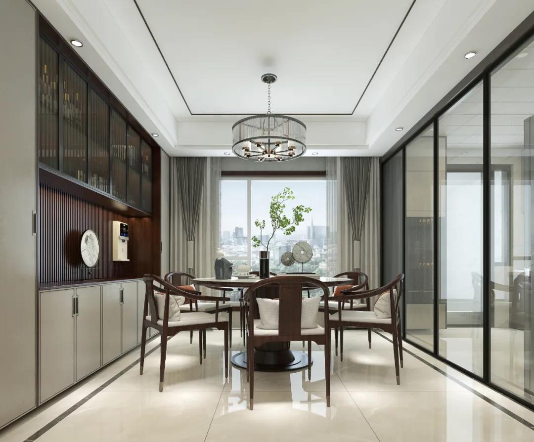 餐邊柜的設(shè)計(jì),利于物品的擺放和存取。上方柜體門透明,既能做收納之用,也能作酒柜展示之用。與整體風(fēng)格相符合的圓形餐桌,再次點(diǎn)名新中式的主題,更表達(dá)了傳統(tǒng)文化中對“團(tuán)圓”的期待。