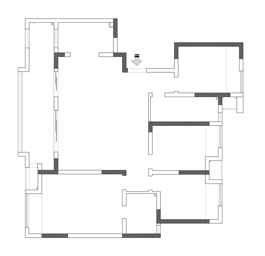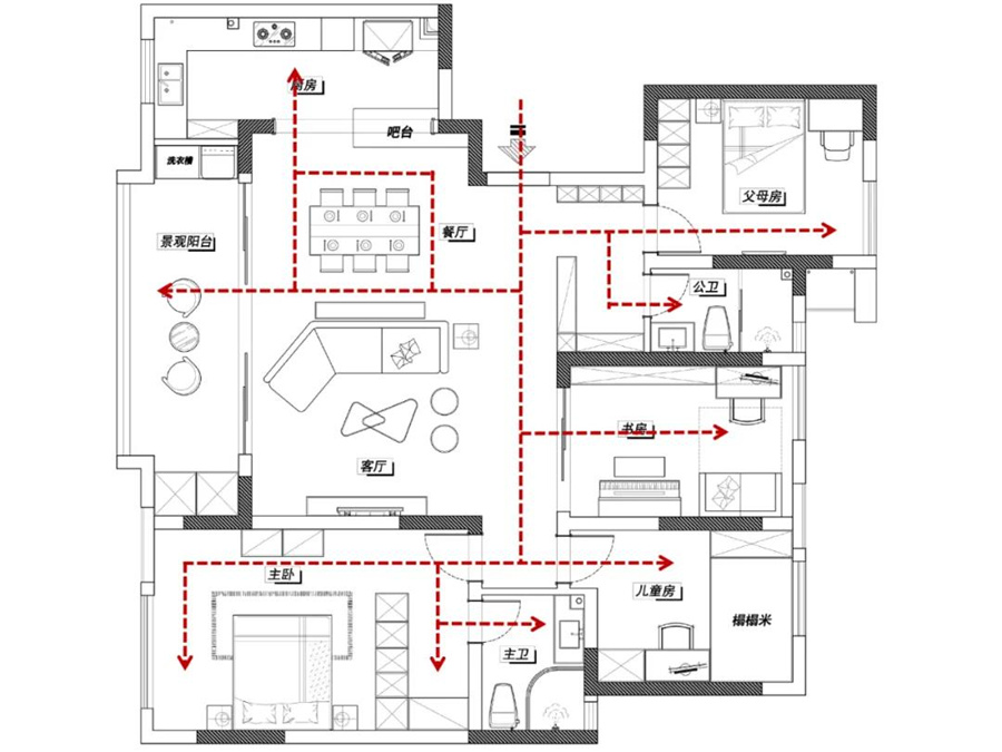 原始結(jié)構(gòu)圖 平面布置動線圖 設(shè)計平面布置圖 玄關(guān)放置換鞋凳,家中老人進出換鞋更方便。一旁的小吧臺能很好地起到隔斷作用,將父母房和衛(wèi)生間隔開,使精簡功能分區(qū)更明確。吧臺
