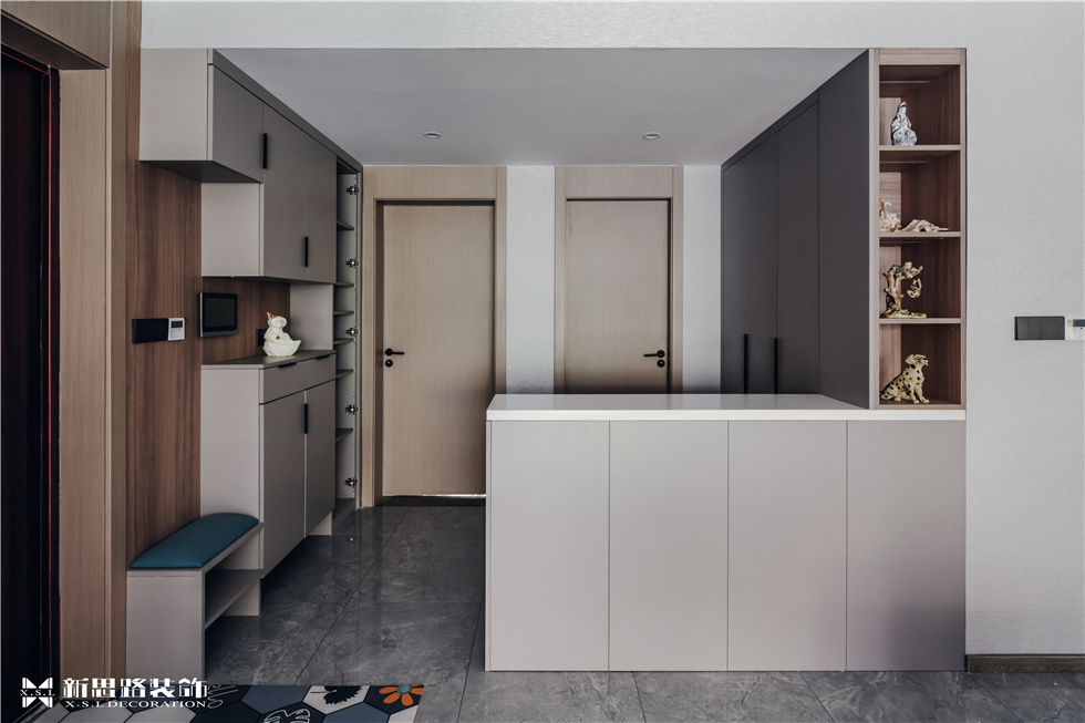玄關(guān)放置換鞋凳,家中老人進出換鞋更方便。一旁的小吧臺能很好地起到隔斷作用,將父母房和衛(wèi)生間隔開,使精簡功能分區(qū)更明確。吧臺上可放置物品,下方的柜體也能增加儲物空間,十分實用。