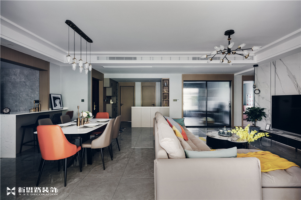 客廳的色彩搭配上選擇撞色設(shè)計,淺色系的白、淺棕、灰,深色系的黑、深棕、藏青,還有冷色系和姜黃、深橘色等暖色系的相碰,為空間增添了不少活力和生機。大理石紋理的電視墻與茶幾、電視柜在低調(diào)中又透出一絲奢華之感,沙發(fā)選用科技布材質(zhì),更加柔軟舒適,忙碌一天回到家后于此小坐,能得到更好的休息與放松