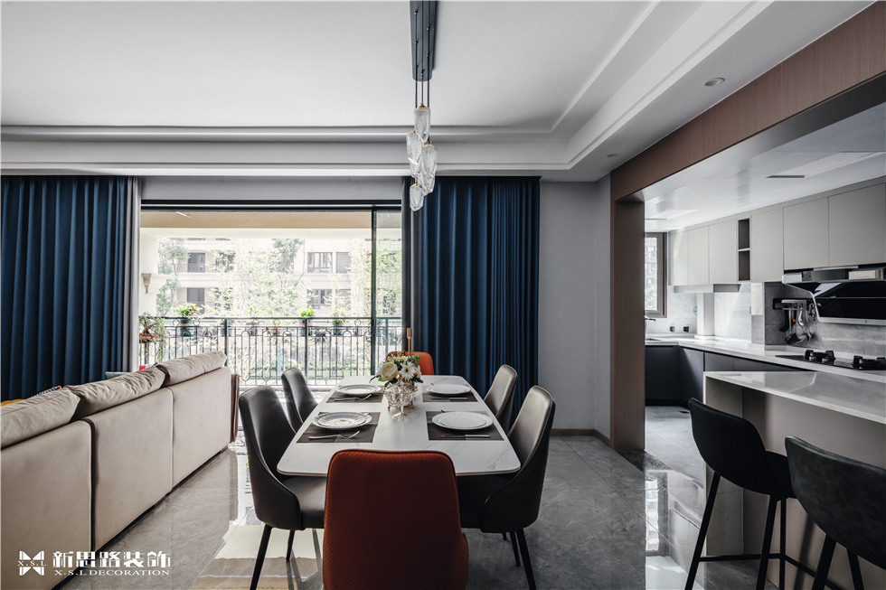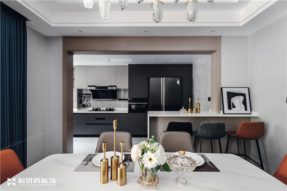餐桌選用六人桌的款式,方中有圓,減輕空間中的棱角感。橙、灰、白拼色的搭配,現(xiàn)代感十足。吊燈造型如花苞又如水晶礦石,簡約又有優(yōu)雅感。獨立的休閑吧臺能起到劃分開放式廚房與客廳空間的作用,其不僅是吧臺,也能作為西餐、冷餐料理臺使用,功能性強。閑來在此品咖啡,小坐娛樂,不失舒適和放松,頗有情調(diào)