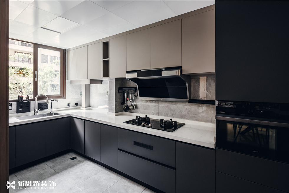 廚房柜體顏色使用深灰和卡其色,造型方正、線條感強,點明現(xiàn)代風格的主題。操作臺沿墻面排布,灶臺、料理臺、水盆等區(qū)域劃分明確,便于整理和打掃。配備超強吸力的油煙機,即使是開放式廚房也不用擔心爆炒等猛火烹飪帶來的油煙。