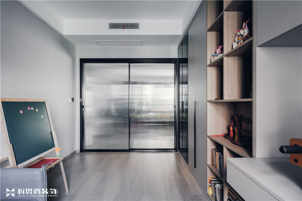 靠近客廳的房間改造成為獨立多功能房,打開門后即可和客廳連為一體,起到間接為客廳分擔部分功能的作用。既能作為休閑娛樂、客人下榻的場所,也能作為書房使用,滿足了客戶想擁有一個安靜閱讀、工作和學習環(huán)境的需求。超大的書柜作為書籍、玩具、擺件的收納之處非常不錯,書桌臨近窗戶,優(yōu)秀采光更加護眼。