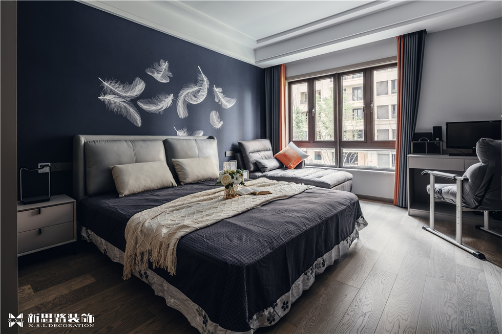 主臥由臥室、衣帽間和主衛(wèi)三個部分構(gòu)成,超多柜體的設(shè)計讓收納不再成為煩惱。整體選擇盡量簡約和減少配飾的設(shè)計思路,力求減輕累贅和繁復感。在配色上,選擇了藏青色和白色的搭配,更深沉穩(wěn)重、有格調(diào),再點綴一抹橙色,空間氣氛不會顯得沉悶。臨近窗戶的位置增添一張沙發(fā),可坐可躺,是個放松和休息的不錯選擇。