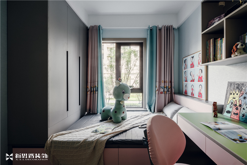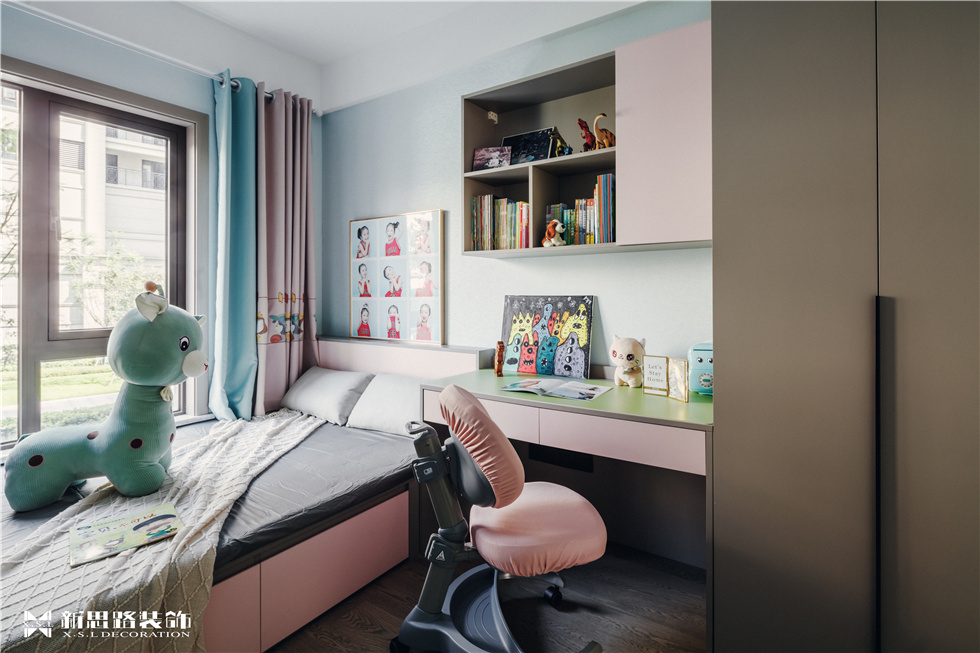 兒童房色調(diào)以小女孩喜歡的藍、粉為主,配以各種卡通裝飾,童趣活潑。床鋪做成了榻榻米的形式,滿足孩子成長時不斷增加的收納需求。獨立的懸掛書柜,不僅能放下孩子喜歡的圖書,小女孩珍藏的小恐龍等擺件和玩偶也有了自己的“住處”。