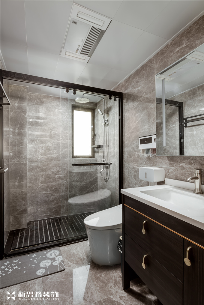 衛(wèi)生間整體使用深卡其色的大理石紋理瓷磚,低調(diào)奢華。干濕分離的設(shè)計很好地隔絕了沐浴會帶來的水汽對柜體的影響,減輕衛(wèi)生間積水和潮濕情況。淋浴間的防滑設(shè)計和馬桶旁的扶手都是為老人貼心準備的,方便老人洗漱,更加安全,不易滑倒。