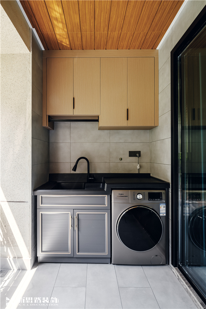 陽臺功能為休閑、洗衣和晾曬區(qū)。大面積向陽晾曬區(qū)滿足一家五口的需求,獨立于衛(wèi)生間的洗衣區(qū)配備洗衣槽,更符合老人的生活習慣。上方衣架收納桿實用又方便,即取即用。