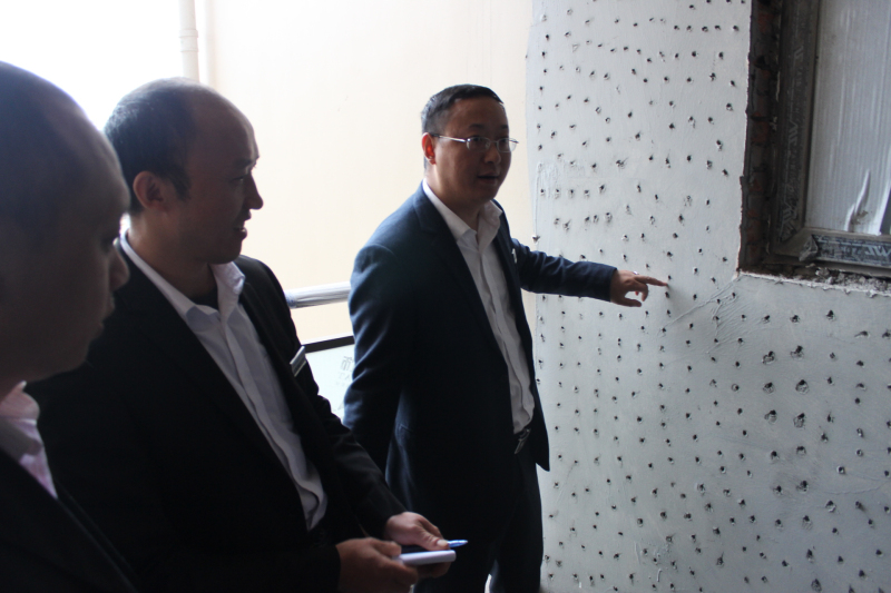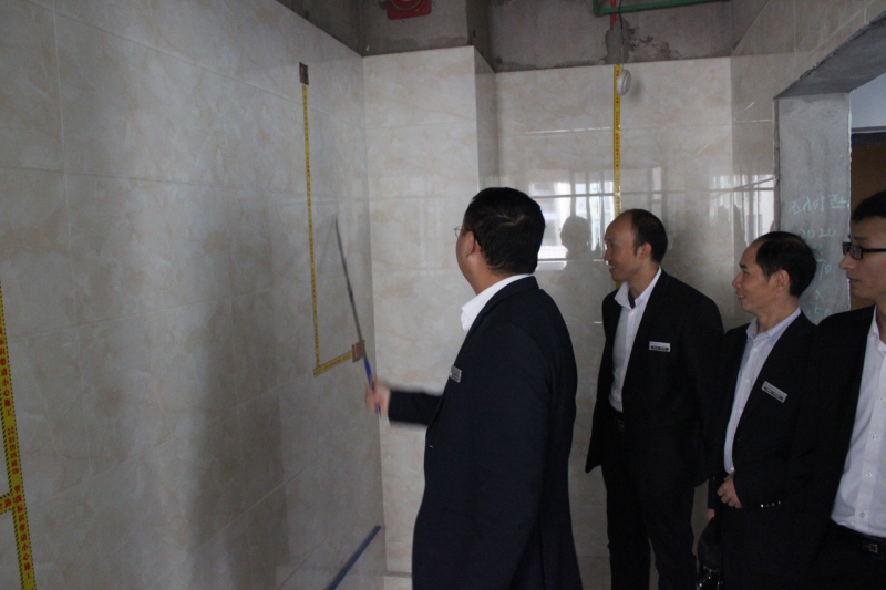 文經(jīng)理正在認真檢查墻面貼磚情況