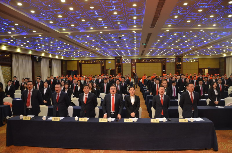 大會(huì)開場,全體員工起立宣讀公司口號(hào)