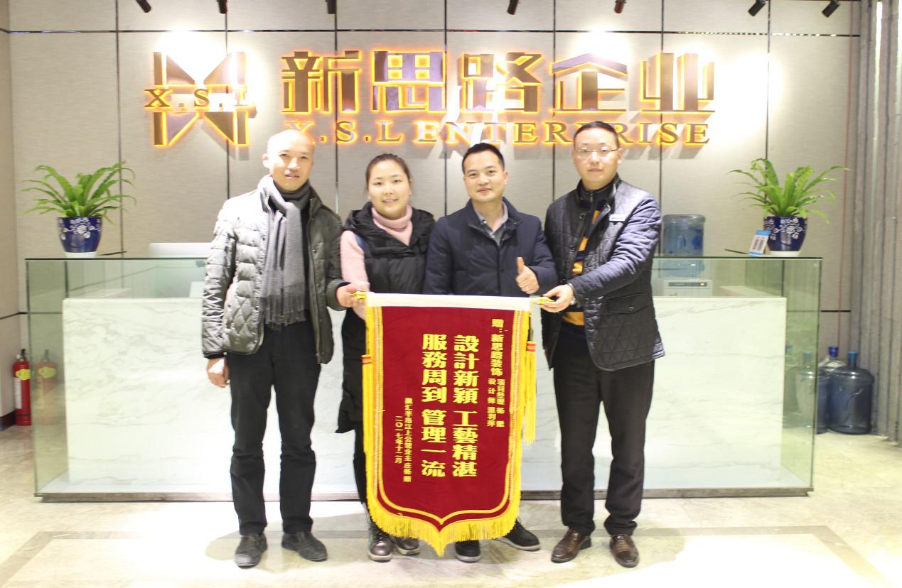 喜上眉梢——2018年的第一面錦旗 1月5日下午,來自融匯半島江上公館的業(yè)主夫婦莊老師和騰老師專程來到新思路裝飾南坪店,送上一面寫有“設計新穎、工藝精湛、、服務周到、管理一流”的大紅錦旗,以感謝新思路裝飾一流的設計方案和裝修質量。