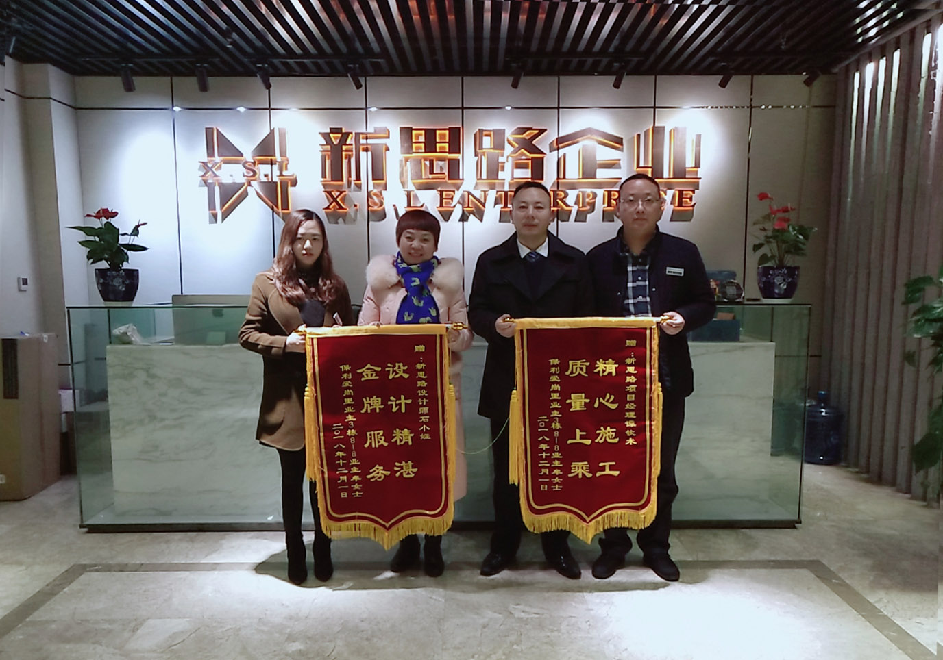 2018年12月7日下午,來自保利愛尚里的業(yè)主牟老師專程來到南坪總部將一面印有“設(shè)計(jì)精湛,金牌服務(wù)”的錦旗交給我們設(shè)計(jì)師石小婭手中,又將一面印有“精心施工,質(zhì)量上乘”的錦旗交到我們項(xiàng)目經(jīng)理譚欽術(shù)手中,以感謝新思路裝飾高品質(zhì)工藝和優(yōu)質(zhì)貼心的服務(wù)。