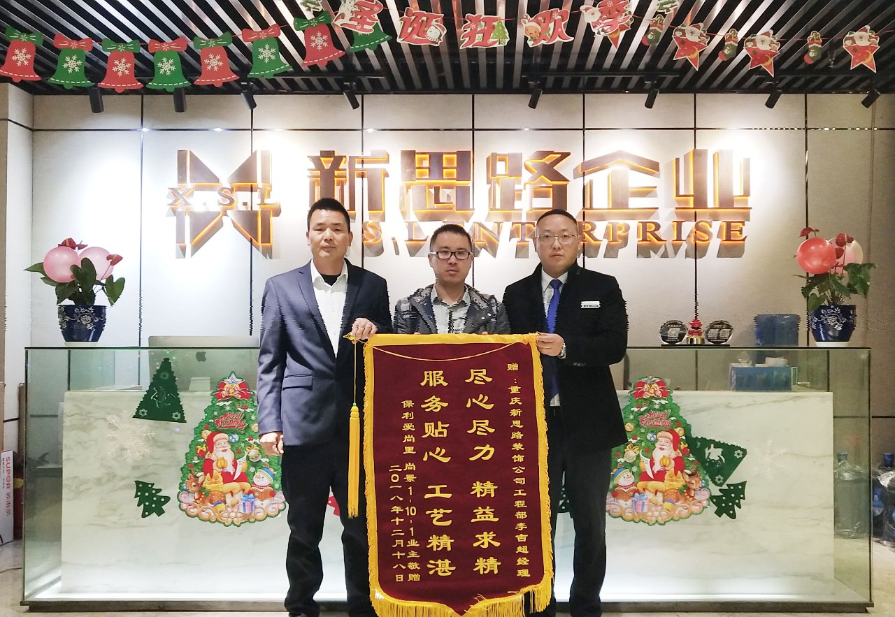 2018年12月24日下午,來自保利愛尚里·尚景的業(yè)主鐘老師專程來到南坪總部,將一面印有“盡心盡力,精益求精,服務貼心,工藝精湛”的錦旗交給我們的項目經(jīng)理李經(jīng)理手中,以感謝新思路裝飾高品質工藝和優(yōu)質貼心的家裝服務。