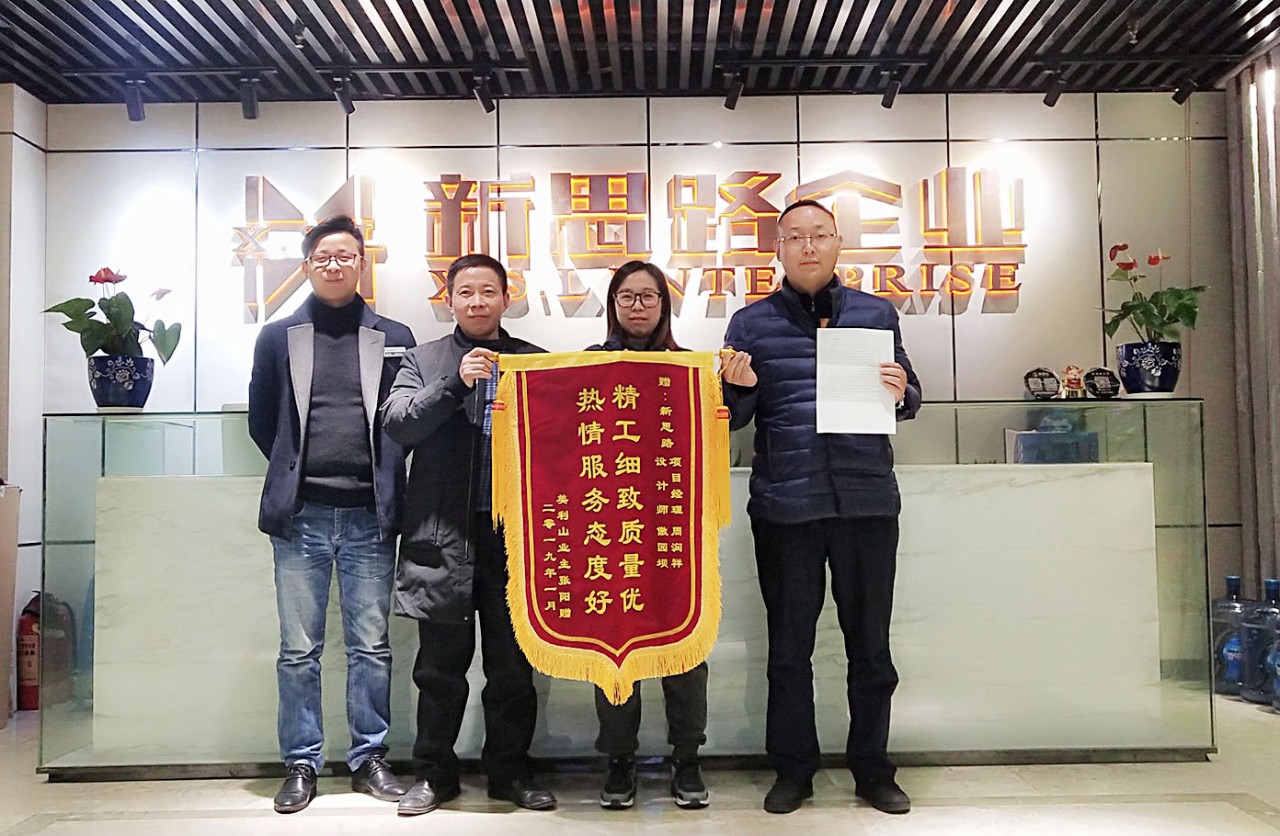 2019年1月23日下午,來(lái)自美利山業(yè)主張老師專(zhuān)程來(lái)到南坪總部,將一面印有“精工細(xì)致質(zhì)量?jī)?yōu),熱情服務(wù)態(tài)度好”的錦旗交給我們的設(shè)計(jì)師敖組長(zhǎng)和項(xiàng)目經(jīng)理周經(jīng)理手中,以感謝新思路裝飾高品質(zhì)工藝和優(yōu)質(zhì)貼心的家裝服務(wù)。