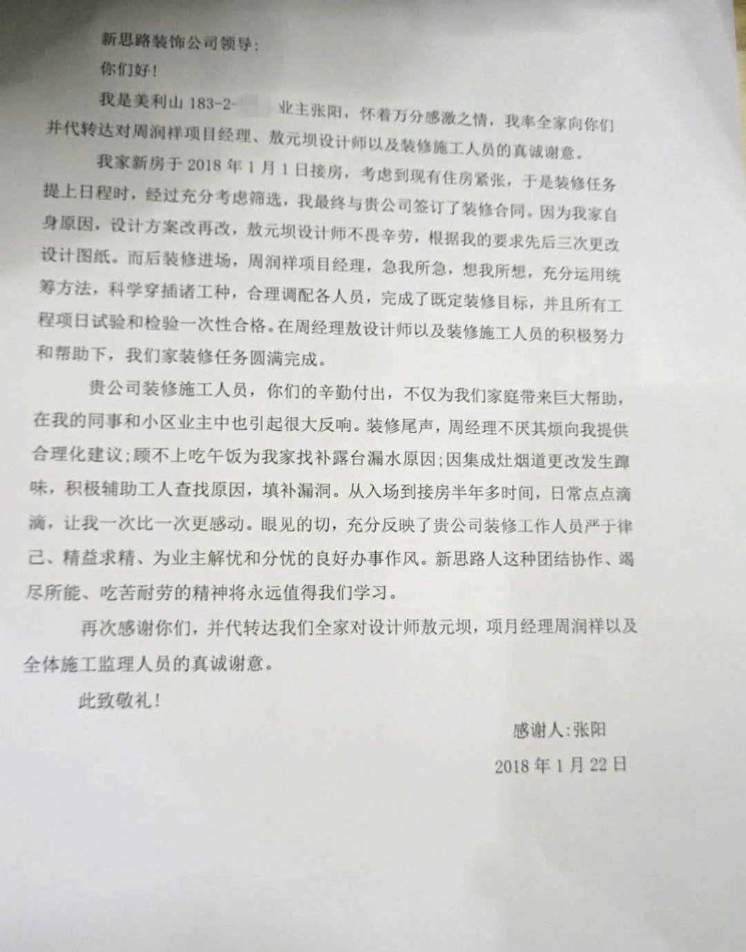 張老師說(shuō)到:“我家新房于2018年1月1日接房,考慮到現(xiàn)有住房緊張,于是裝修任務(wù)提上日程時(shí),經(jīng)過(guò)充分考慮篩選,我最終與貴公司簽訂了裝修合同。因?yàn)槲壹易陨碓?,設(shè)計(jì)方案改再改,敖設(shè)計(jì)師不畏辛勞,根據(jù)我的要求先后三次更改設(shè)計(jì)圖紙。而后裝修進(jìn)場(chǎng),項(xiàng)目經(jīng)理周經(jīng)理,急我所急,想我所想,充分運(yùn)用統(tǒng)籌方法,科學(xué)穿插諸工種,合理調(diào)配各人員,完成了既定裝修目標(biāo),并且所有工程項(xiàng)目試驗(yàn)和檢驗(yàn)一次性合格。在周經(jīng)理敖設(shè)計(jì)師以及裝修施工人員的積極努力和幫助下,我們家裝修任務(wù)圓滿(mǎn)完成。貴公司裝修人員,你們的辛勤付出,不僅為我們家庭帶來(lái)巨大幫助,在我的同事和小區(qū)業(yè)主中也引起很大反應(yīng)。從入場(chǎng)到接房半年多時(shí)間,日常的點(diǎn)點(diǎn)滴滴,讓我一次比一次更感動(dòng)。眼見(jiàn)的一切,充分反映了貴公司裝修工作人員嚴(yán)于律己、精益求精、為業(yè)主解憂(yōu)和分憂(yōu)的良好辦事作風(fēng)。真的,再次感謝你們,并代轉(zhuǎn)達(dá)我們?nèi)覍?duì)敖設(shè)計(jì)師和項(xiàng)目經(jīng)理周經(jīng)理以及全體施工監(jiān)理人員的真誠(chéng)謝意!“
