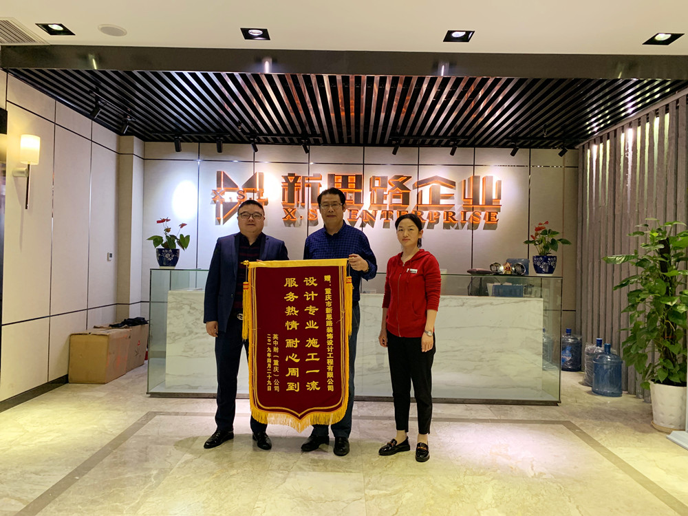 5月4日上午,公裝項目英中耐(重慶)公司段總,為新思路送上一面大紅錦旗。“設計專業(yè)、施工一流;服務熱情、耐心周到”這16個字充分體現(xiàn)出對我們新思路裝飾公裝部的設計、施工及服務的高度認可。