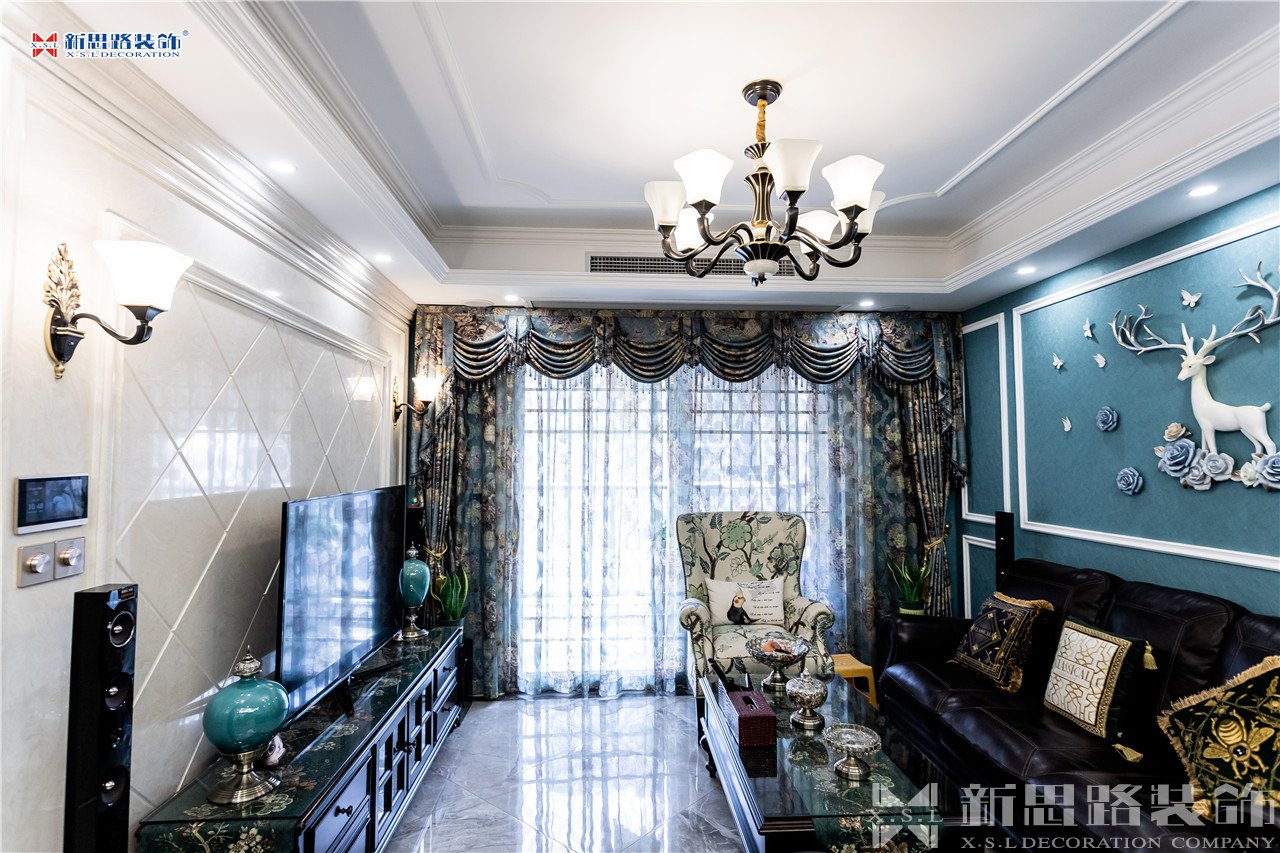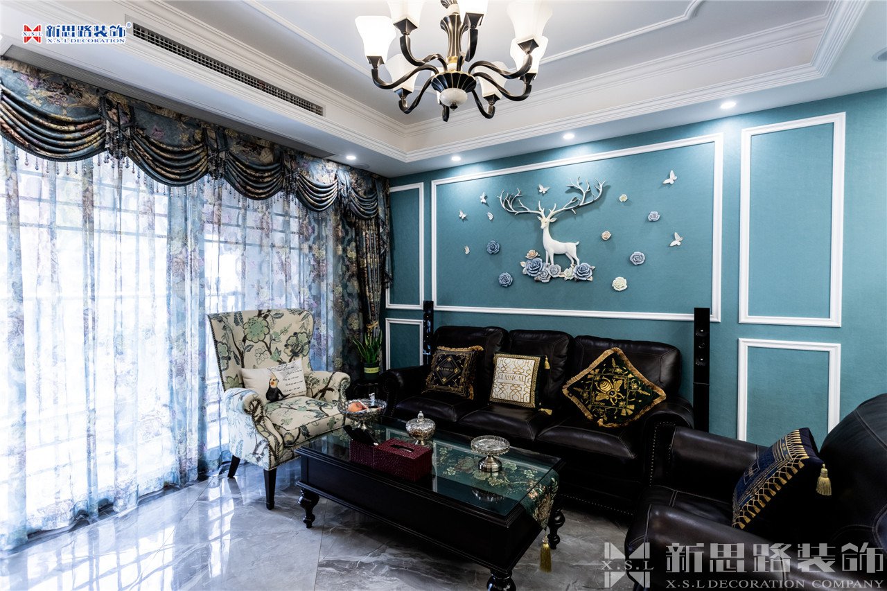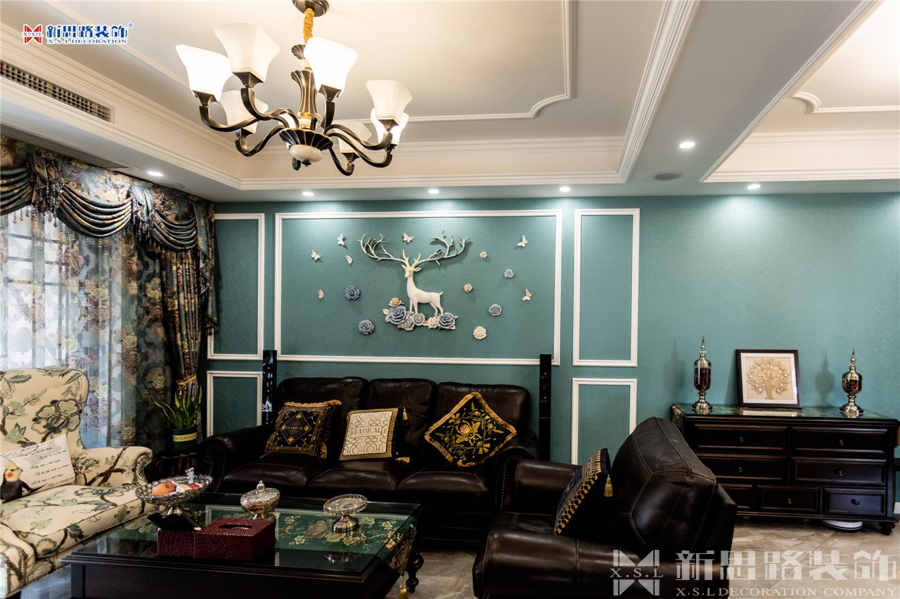 沙發(fā)背景墻使用石膏線材勾畫幾何圖形,古典優(yōu)雅;陶瓷的小鹿漫步花間,野趣橫生。復(fù)古花色的窗簾與真皮質(zhì)地的沙發(fā)以及實木電視柜搭配起來正合適,線條分割成菱形網(wǎng)格狀的乳白色電視背景墻大方低調(diào),黃銅色美式吊燈干凈明亮。深墨綠色的織錦桌旗無形中又添了點(diǎn)奢華意味,油青色的仿古裝飾擺件也是非常經(jīng)典的美式元素體現(xiàn)。