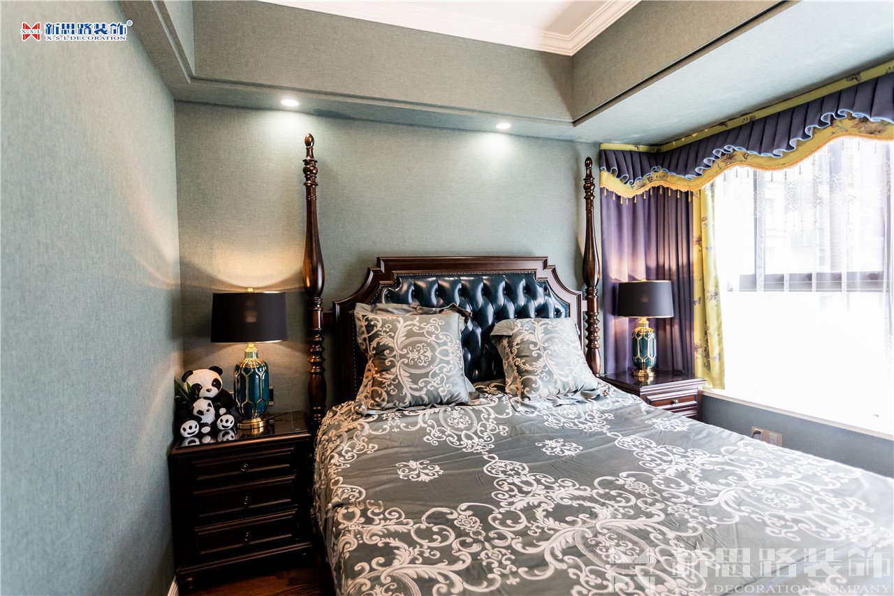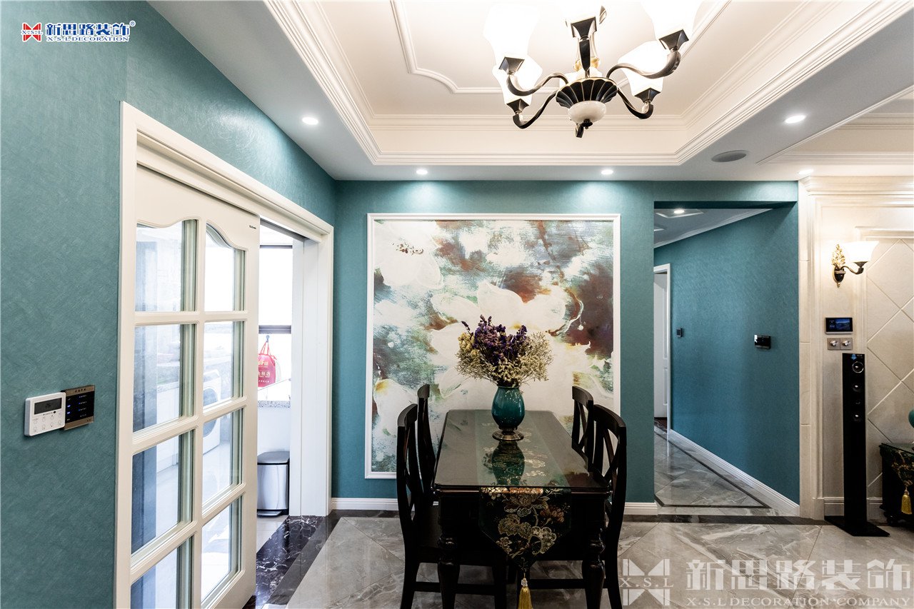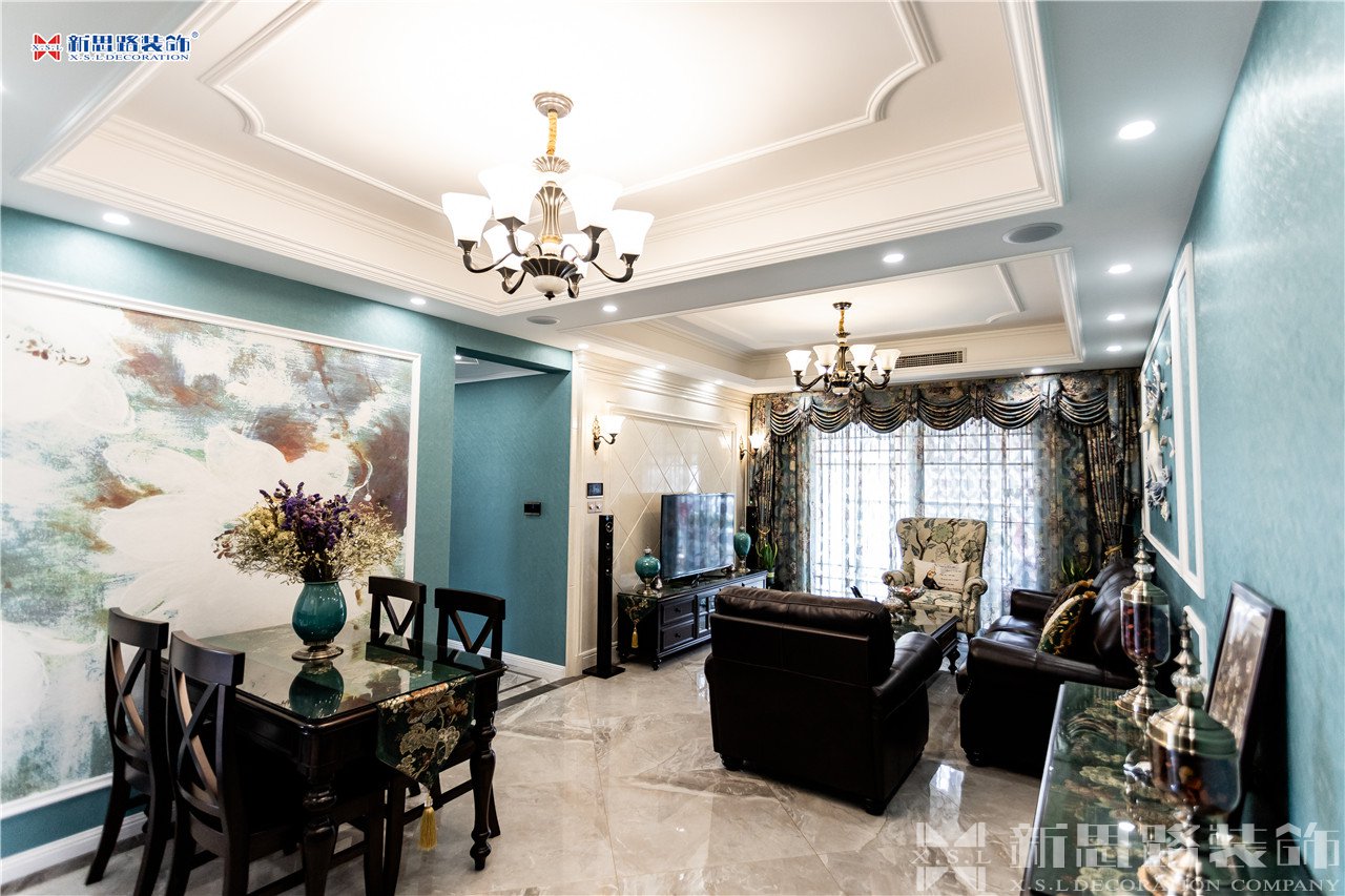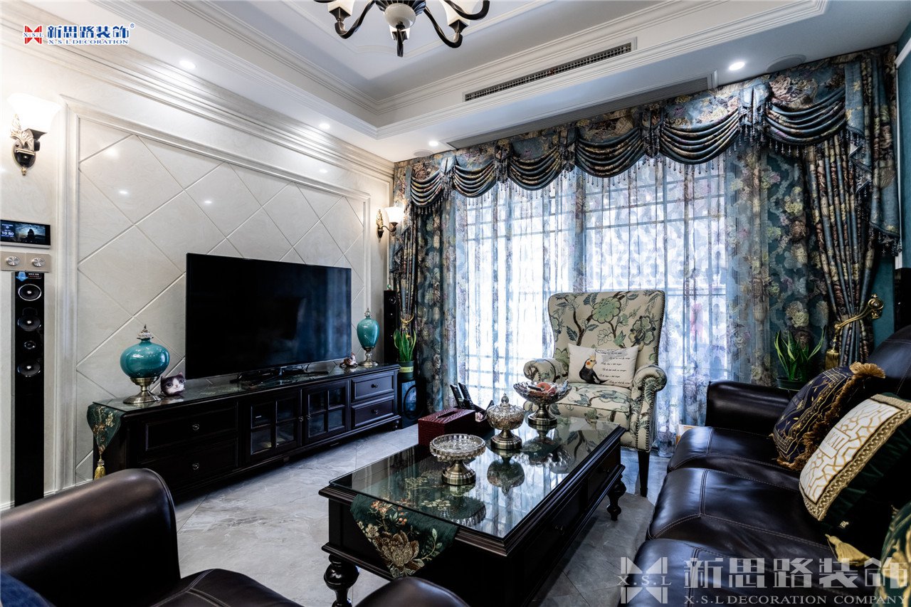 沙發(fā)背景墻使用石膏線材勾畫幾何圖形,古典優(yōu)雅;陶瓷的小鹿漫步花間,野趣橫生。復(fù)古花色的窗簾與真皮質(zhì)地的沙發(fā)以及實木電視柜搭配起來正合適,線條分割成菱形網(wǎng)格狀的乳白色電視背景墻大方低調(diào),黃銅色美式吊燈干凈明亮。深墨綠色的織錦桌旗無形中又添了點(diǎn)奢華意味,油青色的仿古裝飾擺件也是非常經(jīng)典的美式元素體現(xiàn)。
