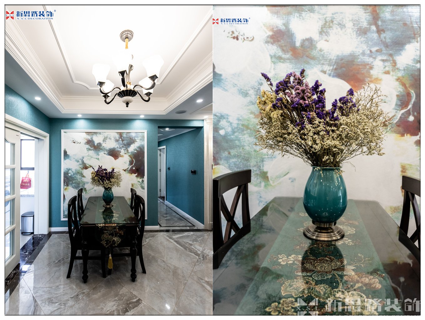 因為想營造出美式風(fēng)格中的復(fù)古歷史感,所以我們選取了顏色很深的琉璃綠色打造整體墻面,客廳再用深淺不同的墨綠色系與深棕色系來進(jìn)行裝飾。