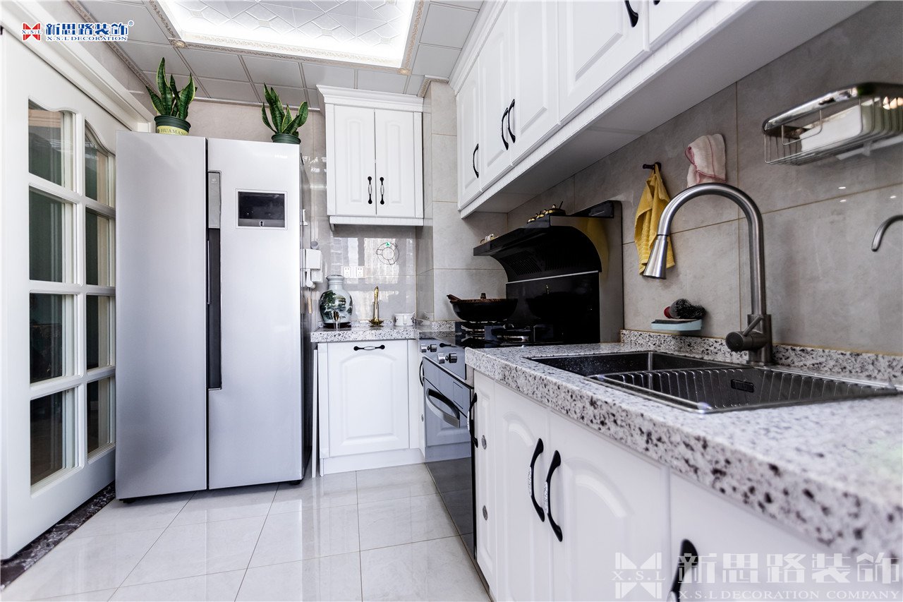 廚房灶臺使用白色大理石材質(zhì)打造,料理臺的設(shè)計更方便食物的制作。櫥柜顏色也選取了同色系的白色,清新干凈,讓本是油煙滿滿的廚房視覺上看起來明亮整潔。