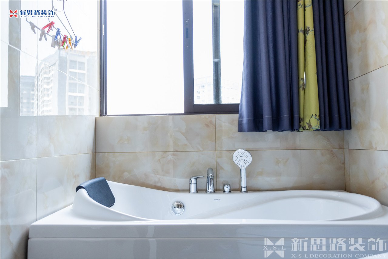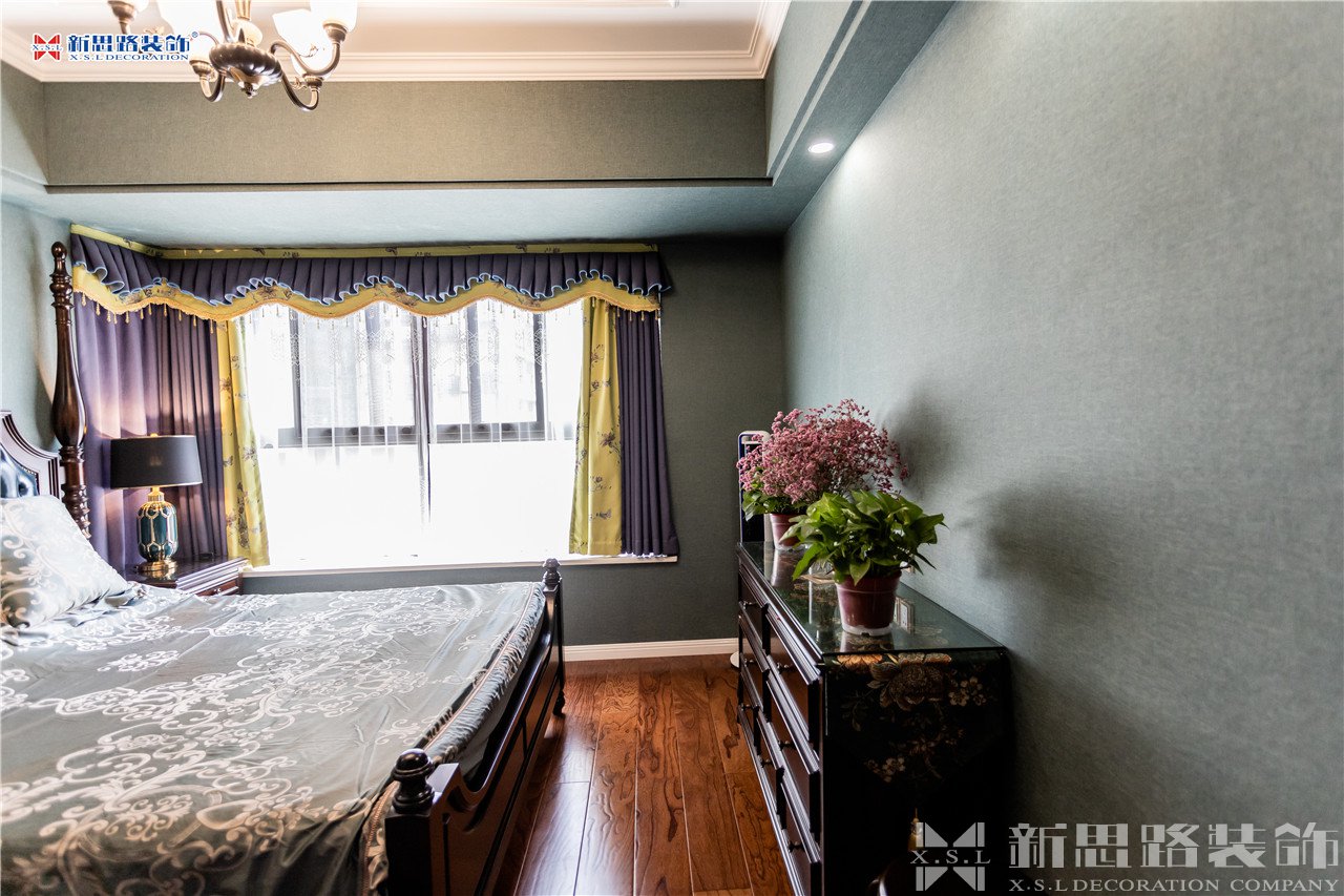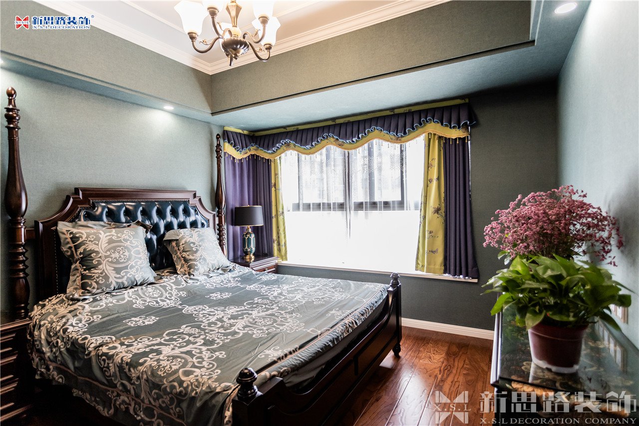 深色木質(zhì)家具與復(fù)古風(fēng)的裝飾正是美式裝修風(fēng)格的亮點(diǎn)之一,深青色的皮質(zhì)床頭與墻面色系相統(tǒng)一。衛(wèi)生間的浴缸設(shè)計非常適合休息之時放松泡澡,桌子上的上永生花與盆栽點(diǎn)綴房間,生機(jī)勃勃。