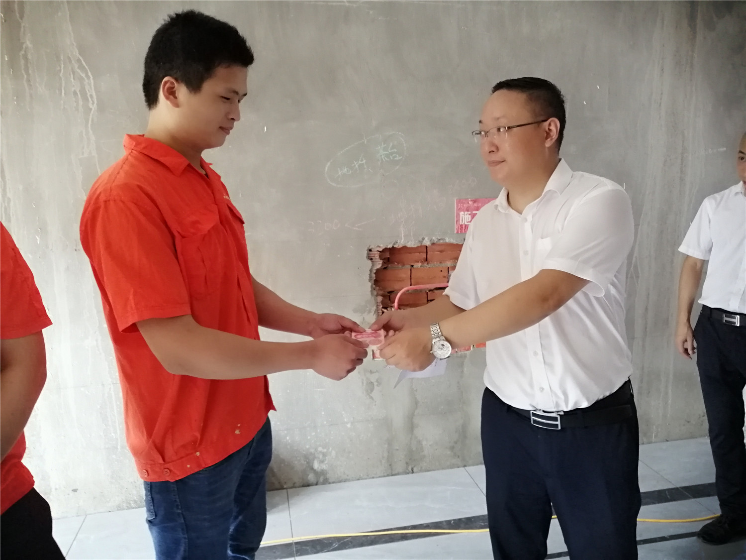 文經(jīng)理給問題回答正確的工人現(xiàn)場發(fā)放現(xiàn)金獎勵