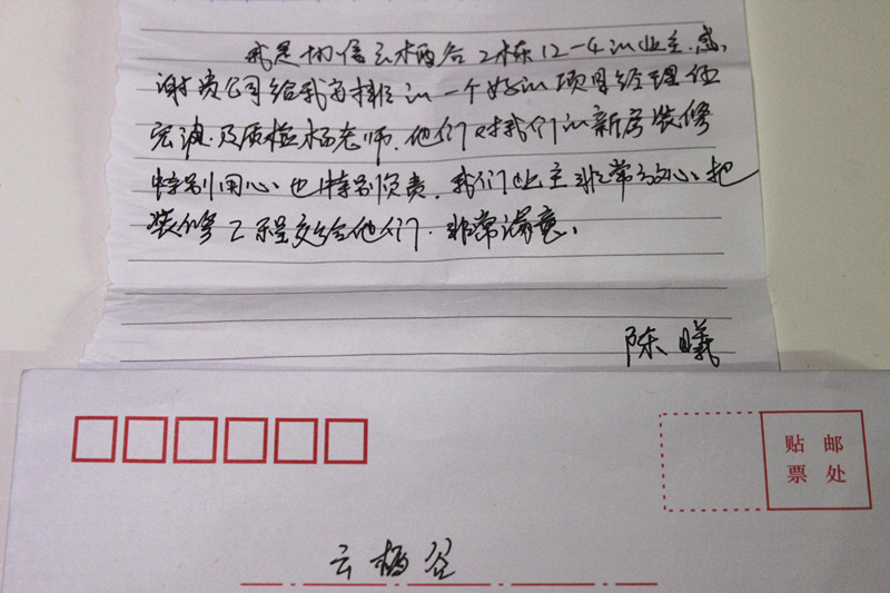 小小的一封感謝信,代表著客戶對新思路裝修品質(zhì)的巨大認可,也凝聚著所有新思路人“做一個工地,就做成一個樣板”的努力和心血。感謝客戶的信賴和支持,我們將以此為動力,全新全意做客戶品質(zhì),打造出更多的“精品工程”、“樣板工程”,來回報我們的客戶。
