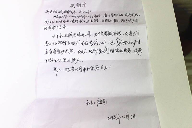 顏老師在信中表示:“由于本人長期在外地工作,無暇兼顧裝修,在貴公司的悉心管理下順利完成裝修工作。貴公司專業(yè)的裝修團隊,提供優(yōu)質(zhì)的服務,裝修期間王經(jīng)理認真負責,質(zhì)檢定期巡查工地,保證了工程質(zhì)量。在此,感謝貴公司提供的裝修服務,感謝王經(jīng)理的細心照應。”