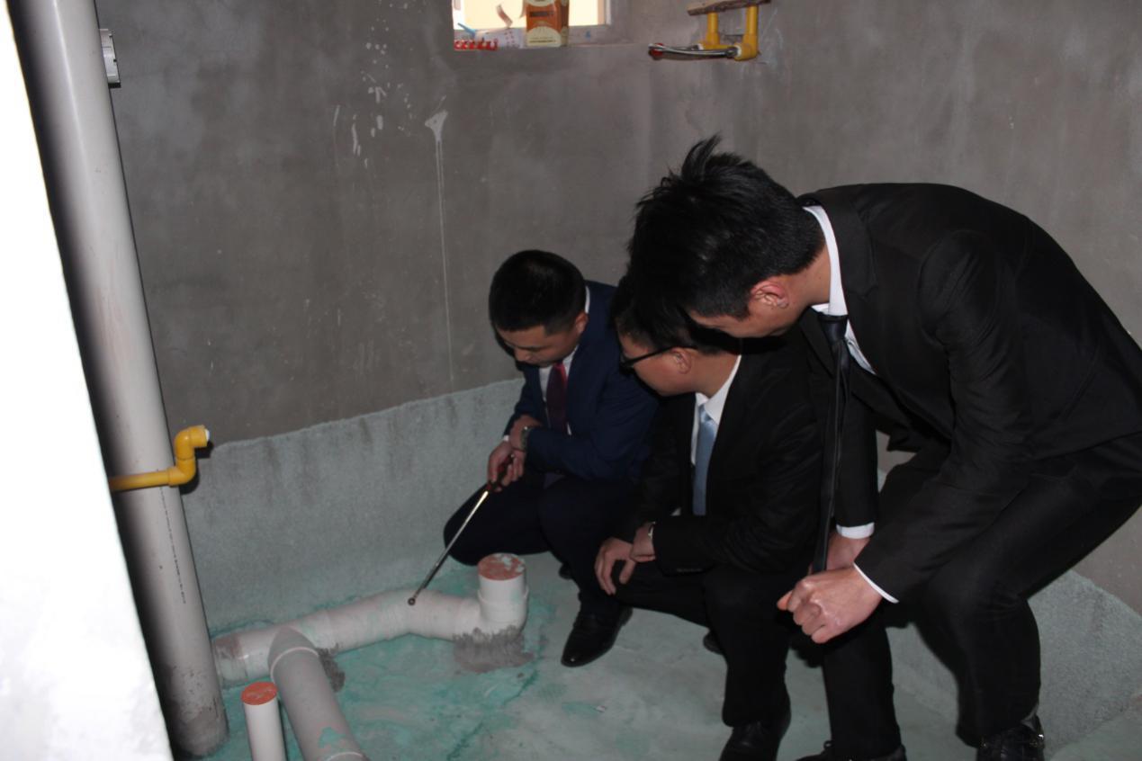(南坪店楊店長正在檢查防水、給排水的施工流程及工藝)