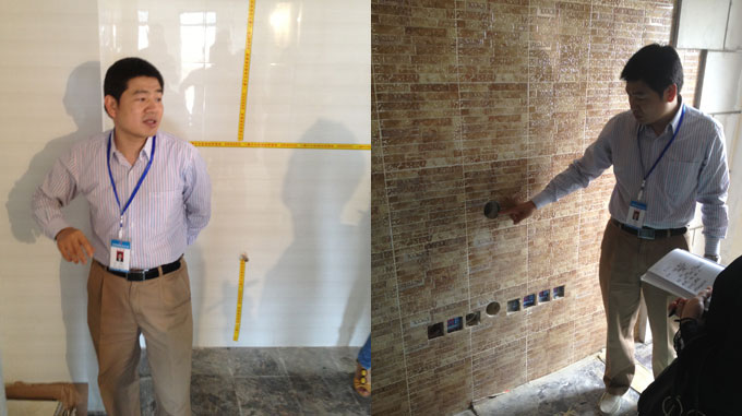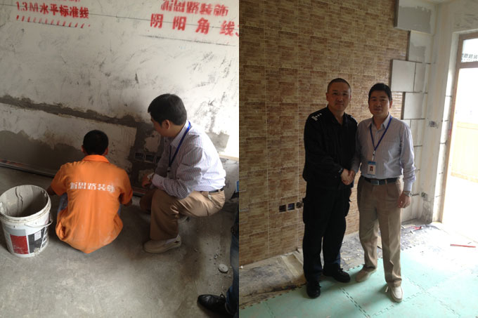 首先,我們來到位于沙坪壩濱江路的華宇金沙時代小區(qū)。到達施工現(xiàn)場正值漆工師傅緊張有序的施工,我們首先對泥作工藝進行了查看,瓷磚的平整度、接縫差等一系列進行了檢驗。張總就工藝細節(jié)與大家共同探討,并在現(xiàn)場提出工藝上的問題,大家都積極的回答。當即張總指出,我們的每一位員工都要對我們的施工工藝清楚的了解到,并如實的告知客戶。這樣才是真正讓客戶明明白白裝修。