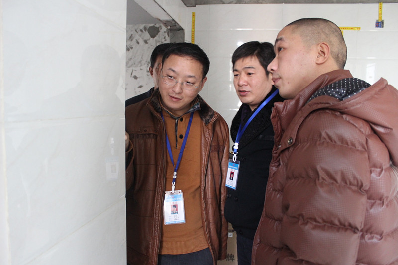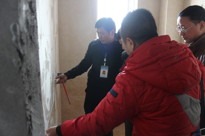 巡查小組在認(rèn)真探討墻面貼磚工藝細(xì)節(jié)