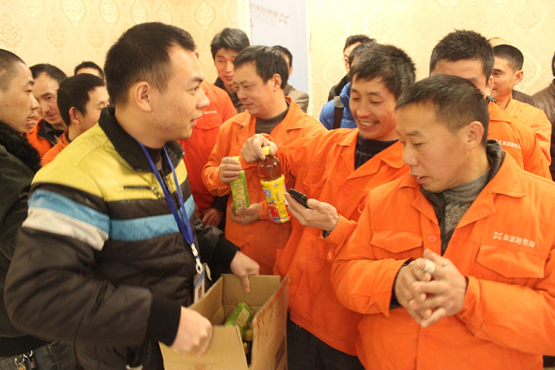 質檢正在給工人師傅們發(fā)放飲品,這體現(xiàn)了新思路以人為本的企業(yè)文化