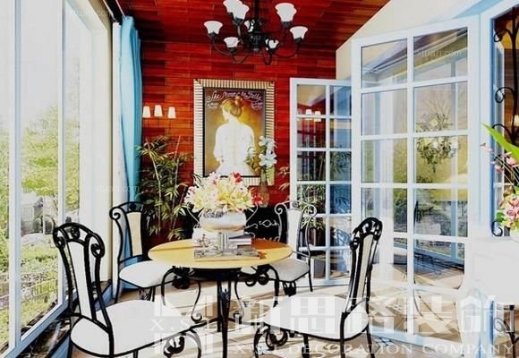 簡歐風(fēng)格是歐式風(fēng)格的一種,主要以簡約、大氣為主。其顏色以御品黃和象牙白等淺色系為主,以深色系為輔,勾勒出簡單的歐式風(fēng)格設(shè)計。如我們圖中看到的一樣。該露臺用原木色的木材做框架,四周和屋頂用透明玻璃打造,椅子和桌子都是象牙白色,旁邊依稀放著一株綠色植物,整個空間沒有多余的裝飾物;從外面看過去,整個露臺非常干凈、明亮。相對于濃厚的歐洲風(fēng)格來說,簡約清新的簡歐風(fēng)格更符合中國大多數(shù)家庭的審美。
